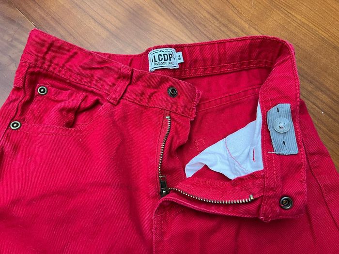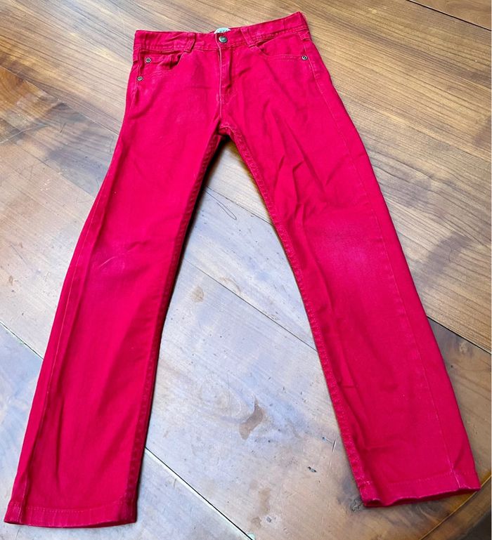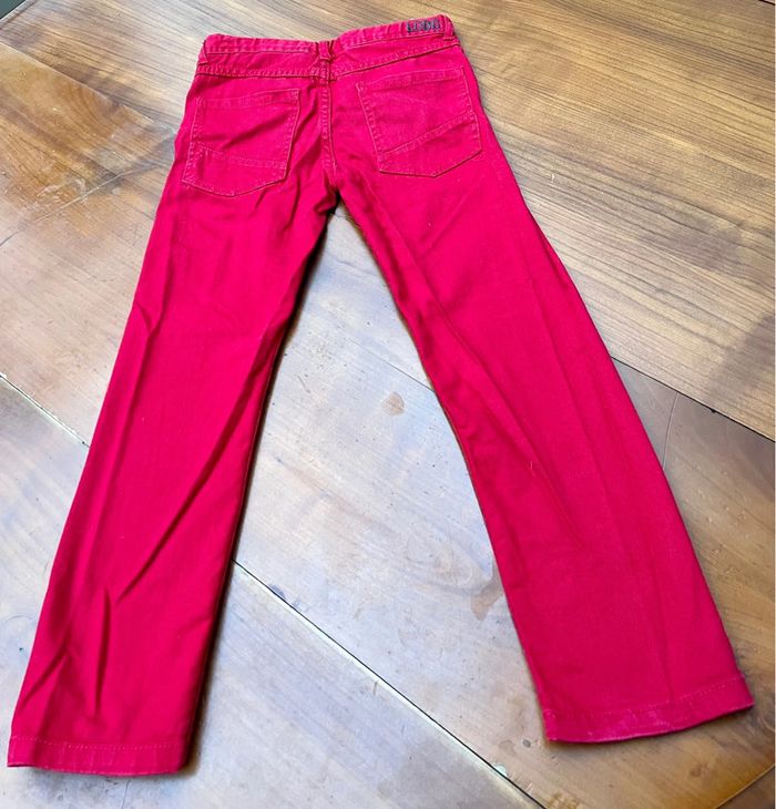 Jean rouge de la marque La compagnie des petits en taille 8 ans. La taille est réglable par deux élastiques. Il comporte deux poches sur les côtés et deux sur les fesses. Composition : 100% coton. Lavable en machine à 40 degrés.