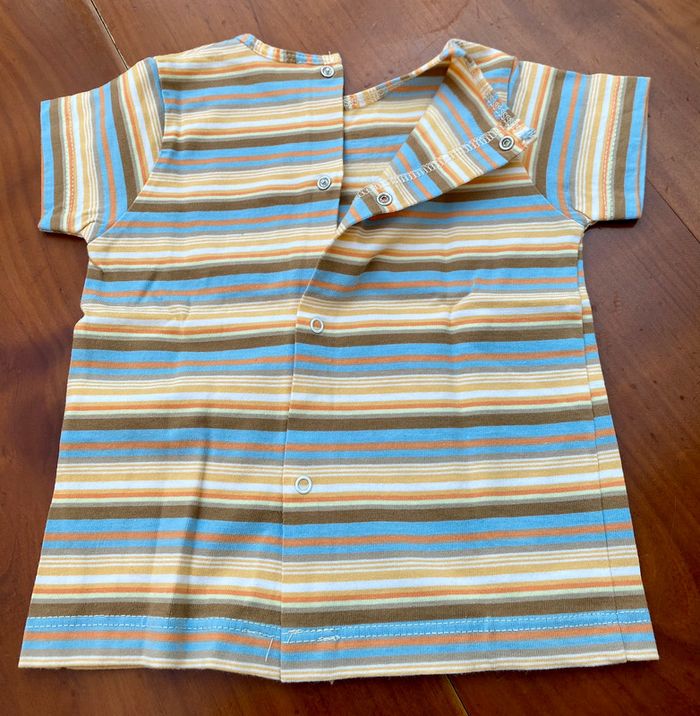 Tee-shirt de la marque Tissaia en taille 12 mois / 74cm. Il s’ouvre entièrement dans le dos par des boutons pression. Composition : 100% coton. Lavable en machine à 40°.