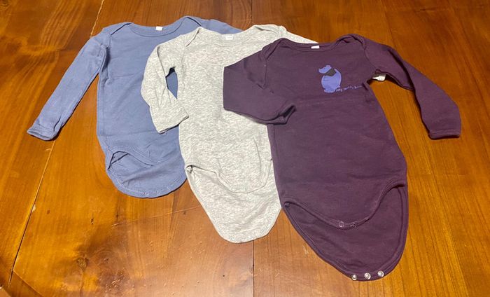 Lot de 3 bodies à manches longues en taille 12 mois / 74cm : un bleu, un gris chiné et un violet à motif d’ours. Composition : 100% coton. Lavable en machine à 40°.
