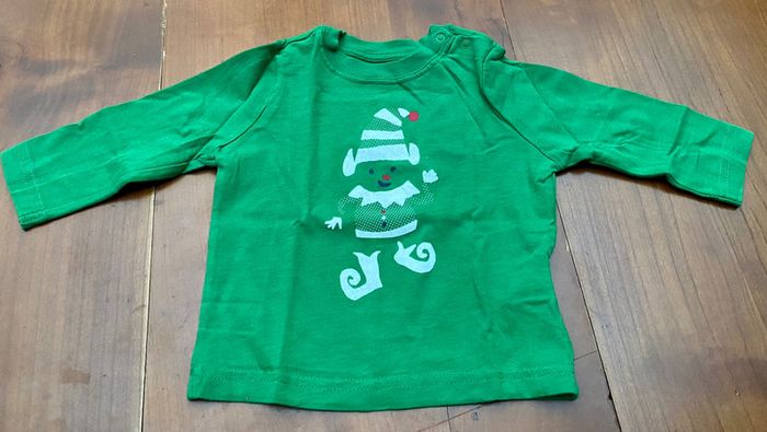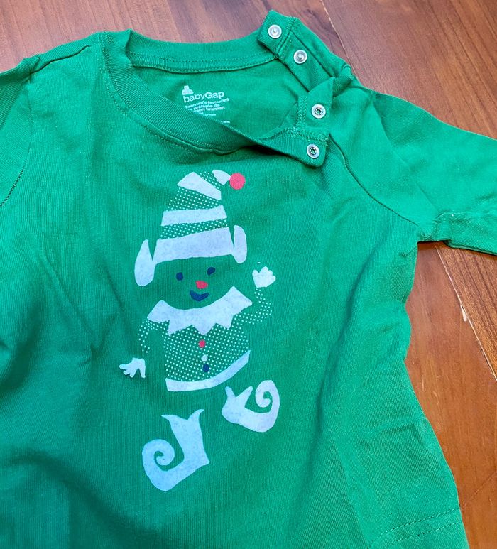 Tee-shirt à manches longues à motif lutin de Noël de la marque Baby Gap en taille 6-12 mois / 75cm. Son col se ferme avec deux boutons pression sur l’épaule gauche. Composition : 100% coton. Lavable en machine à 30°.
