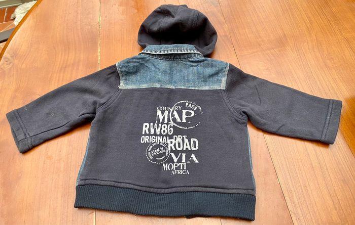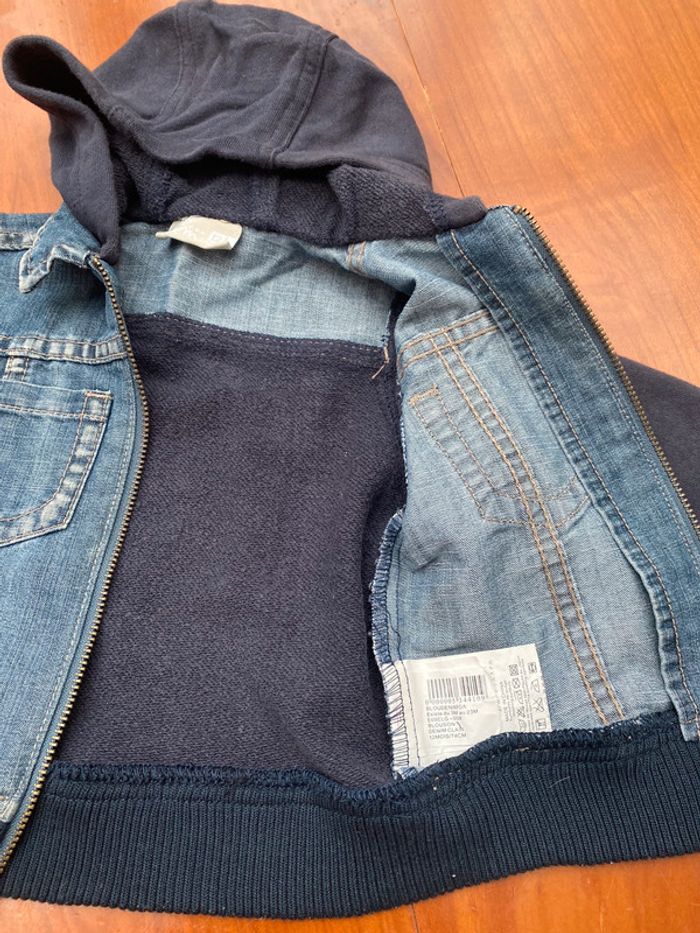 Adorable veste en jean à capuche de la marque Du Pareil au Même en taille 12 mois / 74cm. Composition : 73% coton, 27% polyester. Lavable en machine à 30°.