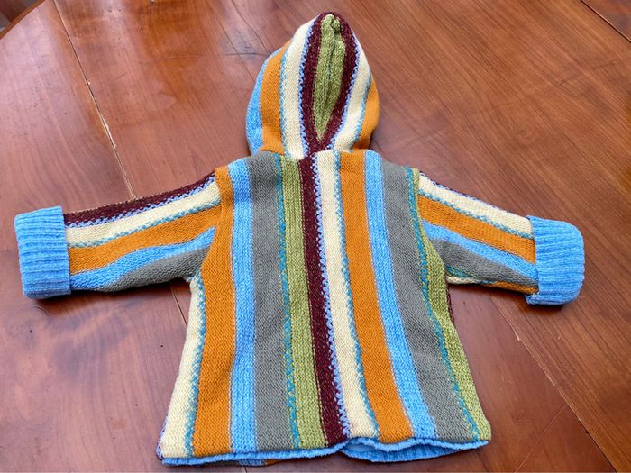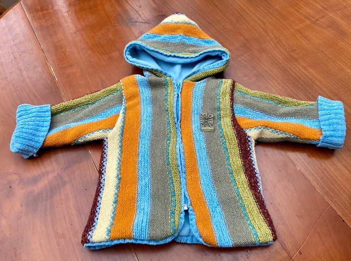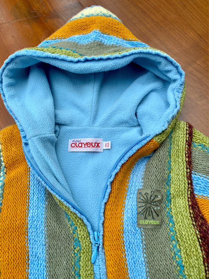 Sweat zippé à capuche en laine et polaire de la marque Clayeux en taille 18 mois / 81cm. Composition : 70% acrylique, 23% laine, 7% autres fibres. Lavable en machine à 30°. Il a bien servi mais est encore en très bon état. Le prénom est écrit sur l’étiquette intérieure.