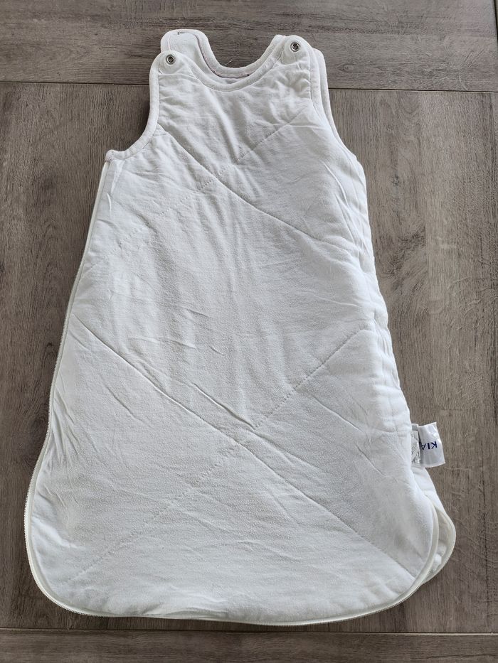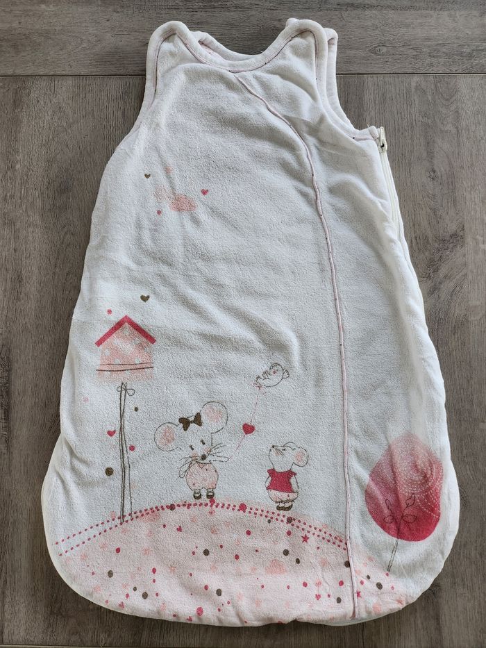 Vends gigoteuse pour couchage hiver, taille 0-6 mois, de couleur blanc et rose, de la marque Kiabi, en coton et polyester. Remise en main propre possible