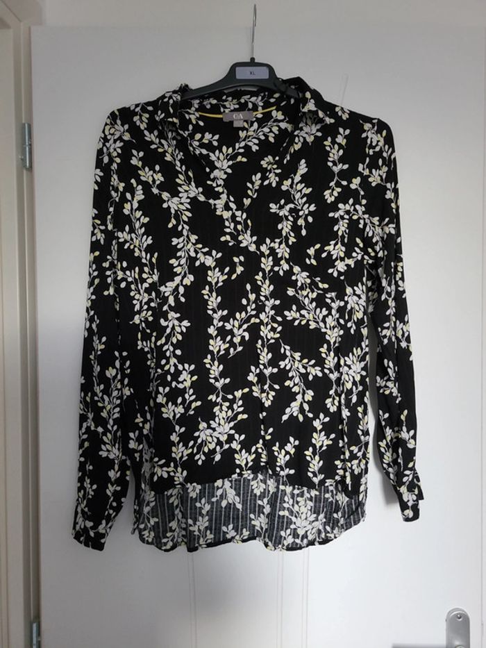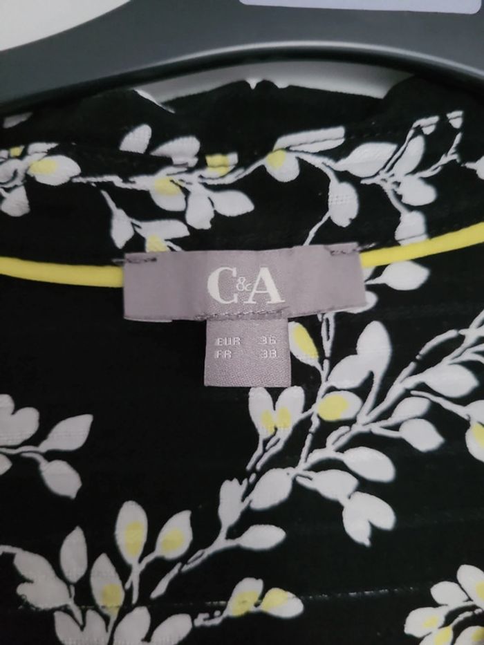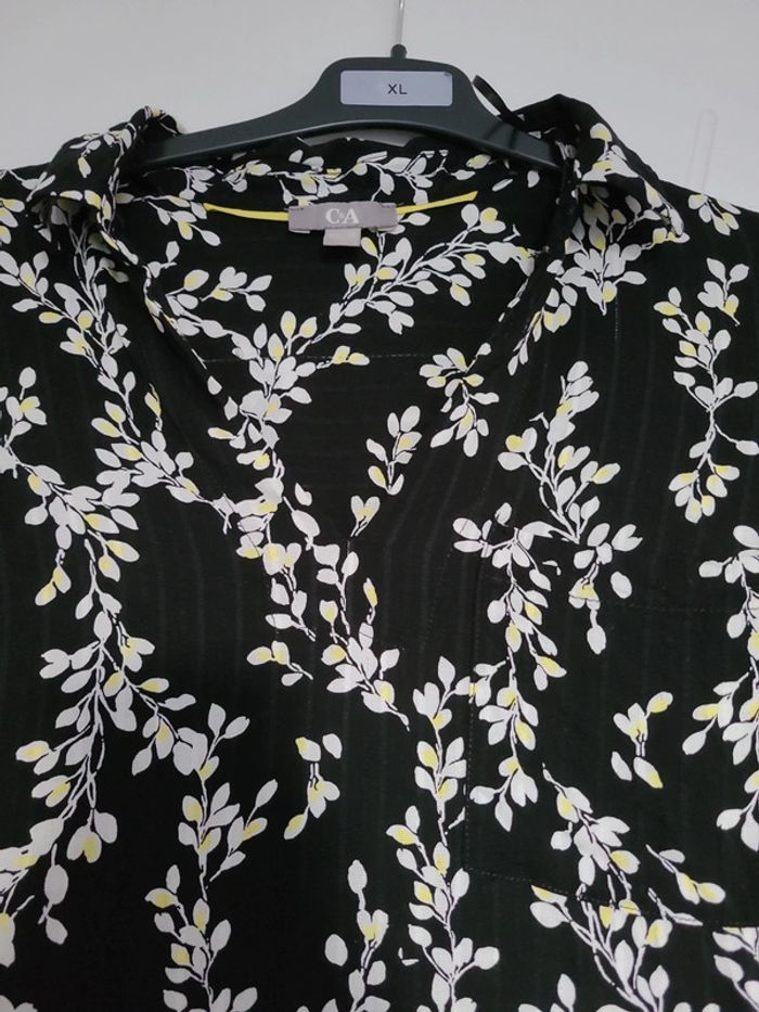 Blouse jamais portée juste lavée. Plus longue à l'arrière. Taille 36/38. Noir à fleurs blanches et jaunes