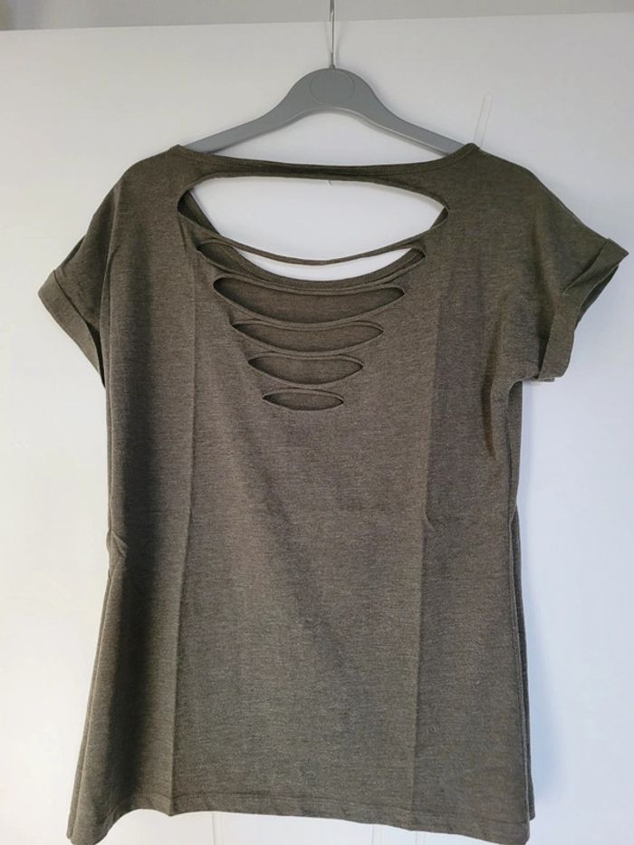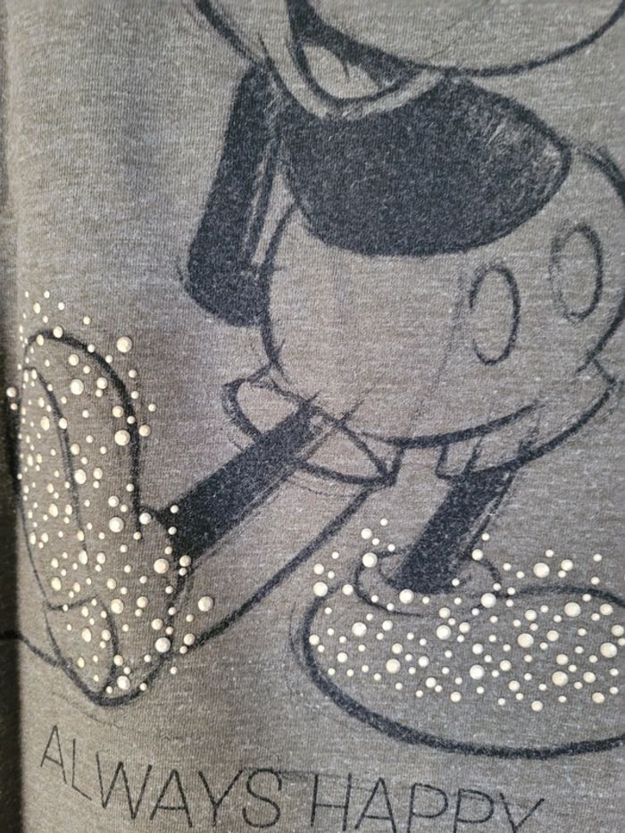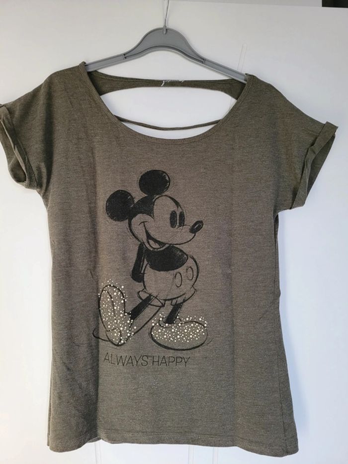 T-shirt en très bon état, clous au niveau des pieds de Mickey, style arraché à l'arrière et manches repliées. Taille très bien
