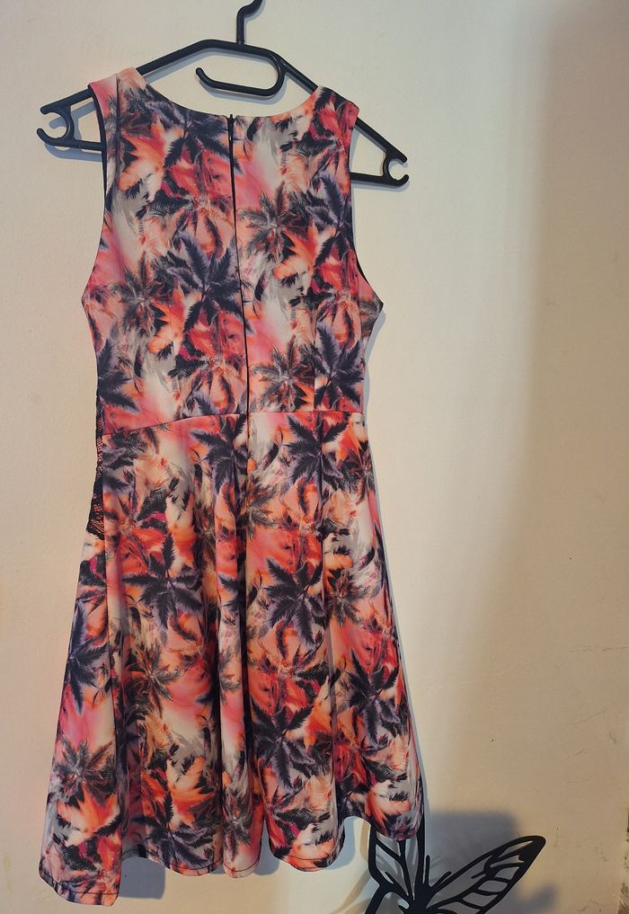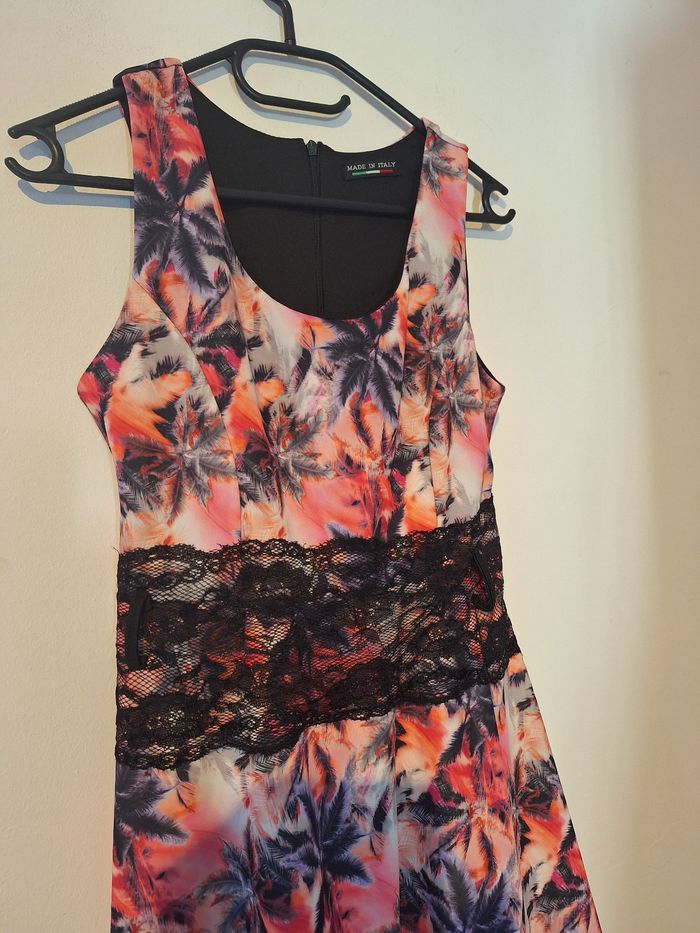 FEMME 38 / M N°1448 robe été Multicolore, palmier Broderie noir Fermeture au dos 95% polyester 5% elasthane Longueur 85 cm Taille 38 / m Made in italy 12€ #kelly_femmeT38