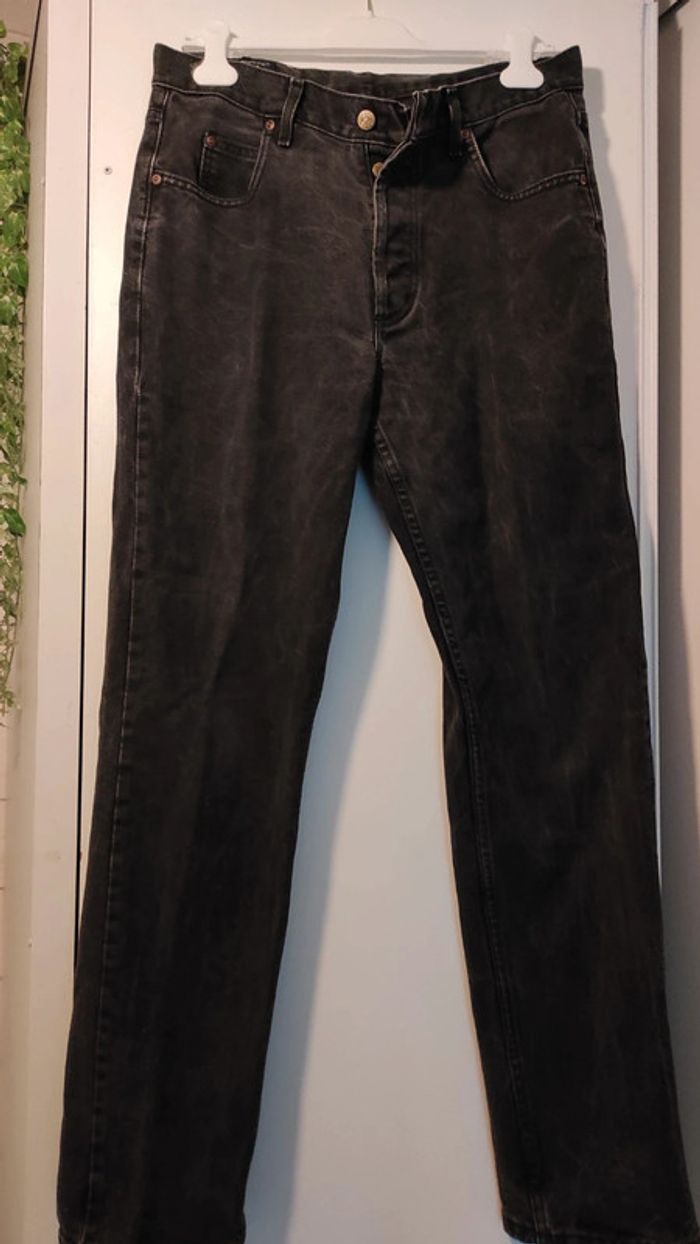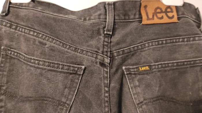 Pantalon jean Lee noir en très bon état général. Un léger défaut d'origine au genou jambe droite très peu visible. Voir dernière photo. 100% coton