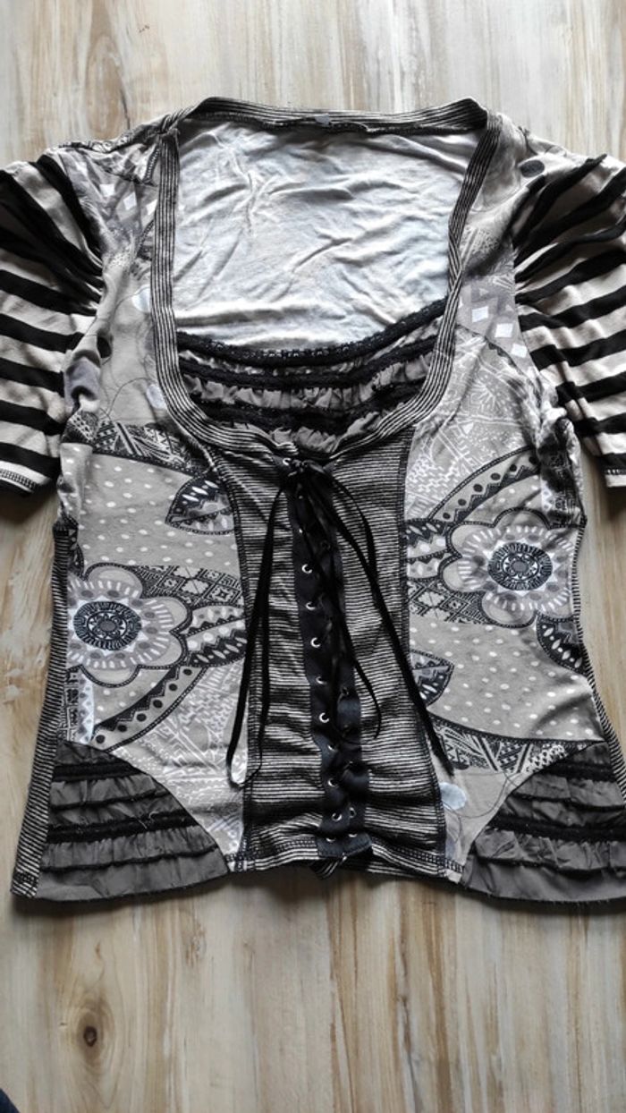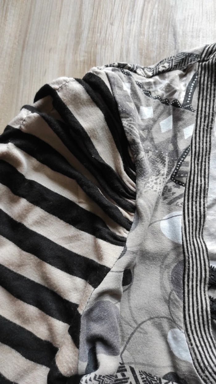 Tee shirt manches courtes effet froncé sur les épaules. En très bon état général . Taille 3 ce qui correspond à un 38/40