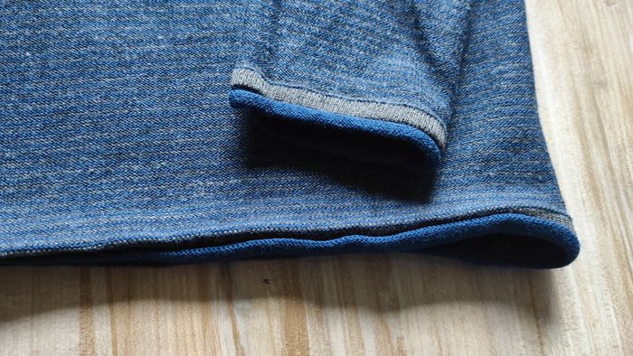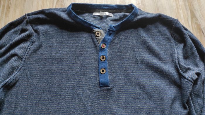 Beau pull à rayures marines et grises. En très bon état. Peu porté. Effet coutures apparentes sur les épaules et les côtés.