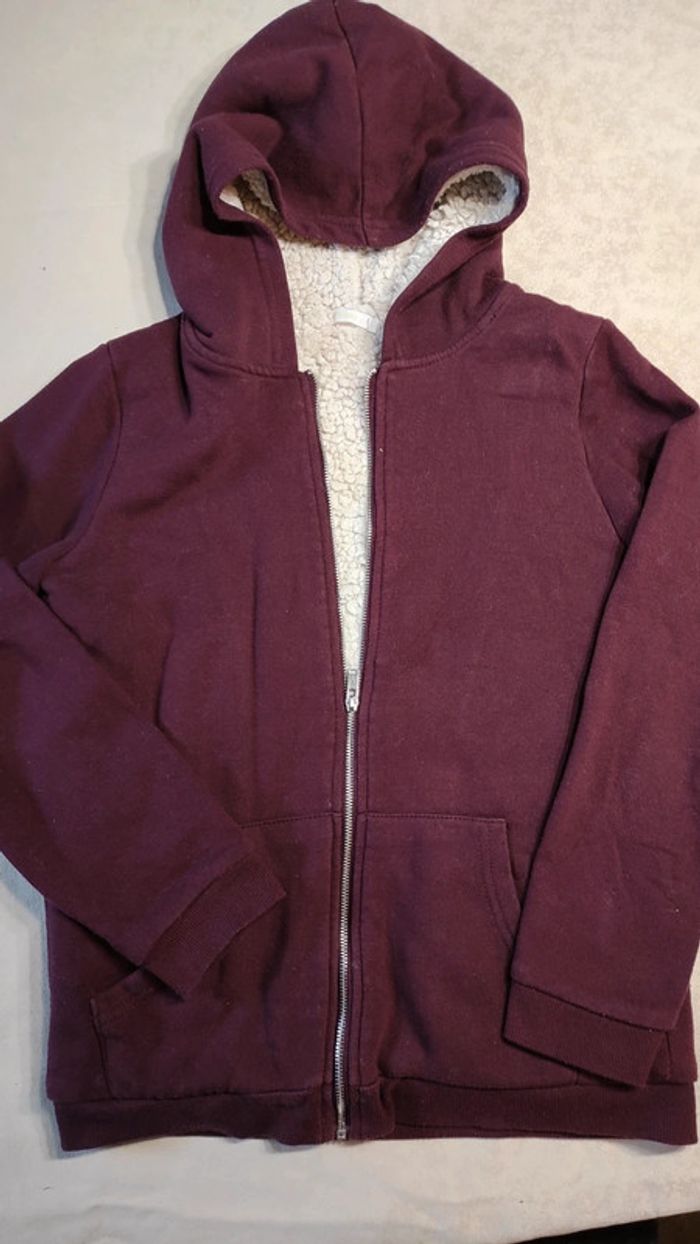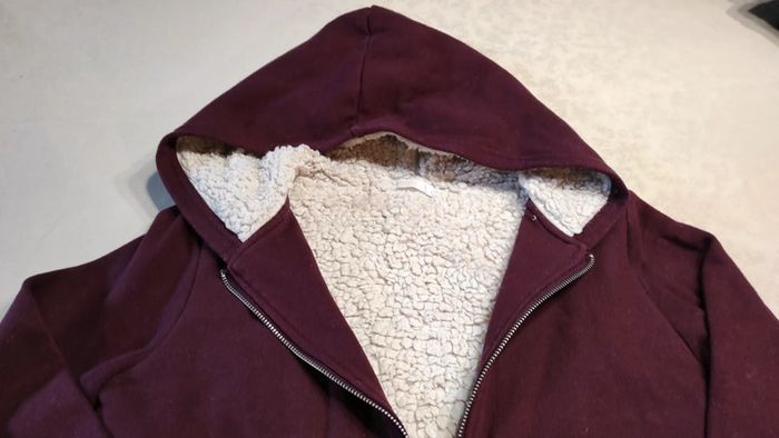 Gilet bien chaud avec capuche en bon état général. Couleur violet. Fermeture éclair.