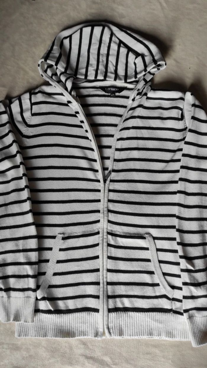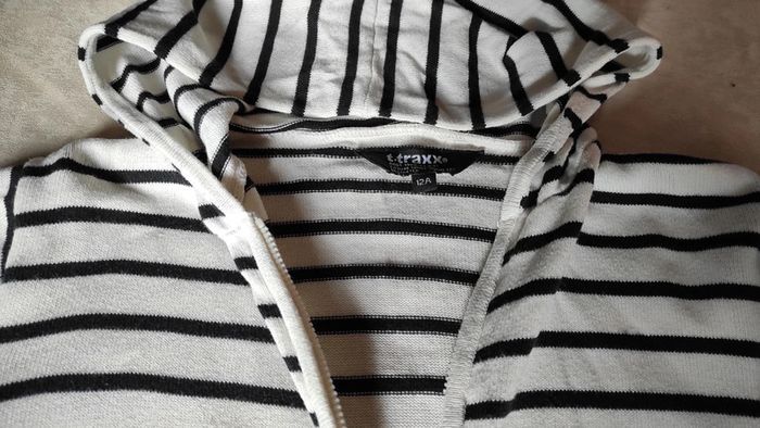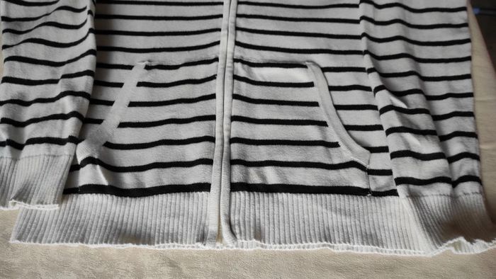 Très joli gilet zippé à capuche. Rayures noires et blanches. En très bon état