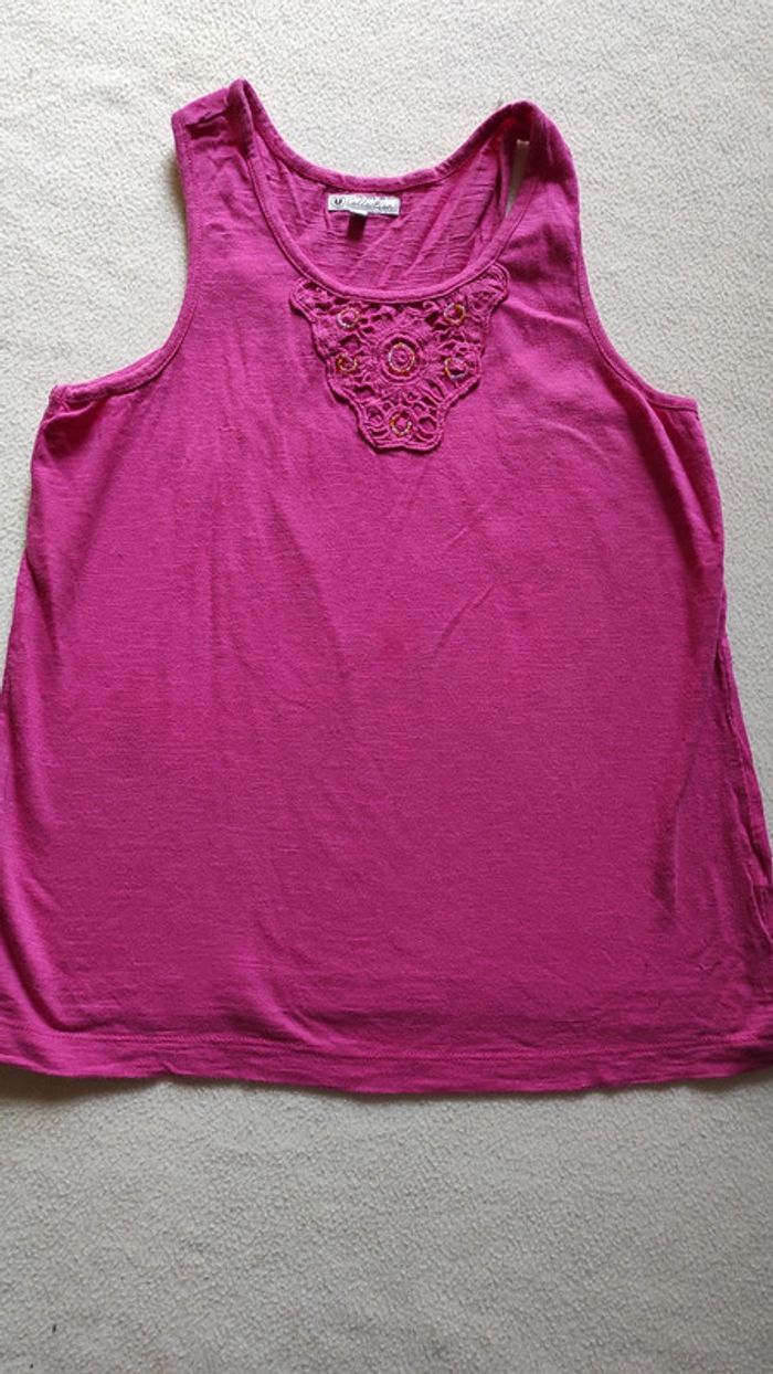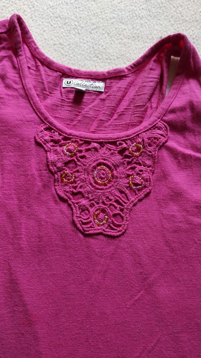 Joli débardeur rose fushia avec broderies et perles devant. Très bon état