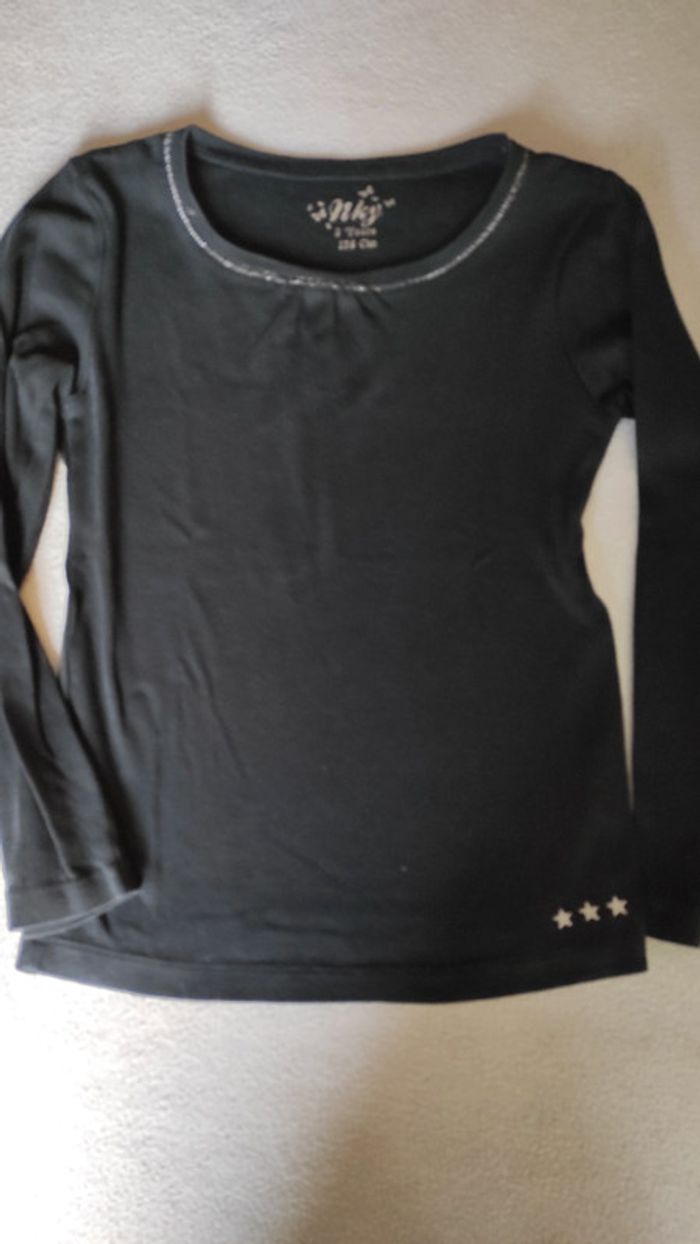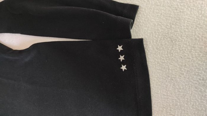Tee-shirt manches longues noir avec encolure argentée et petites étoiles argentées en bas du tee shirt. Très bon état
