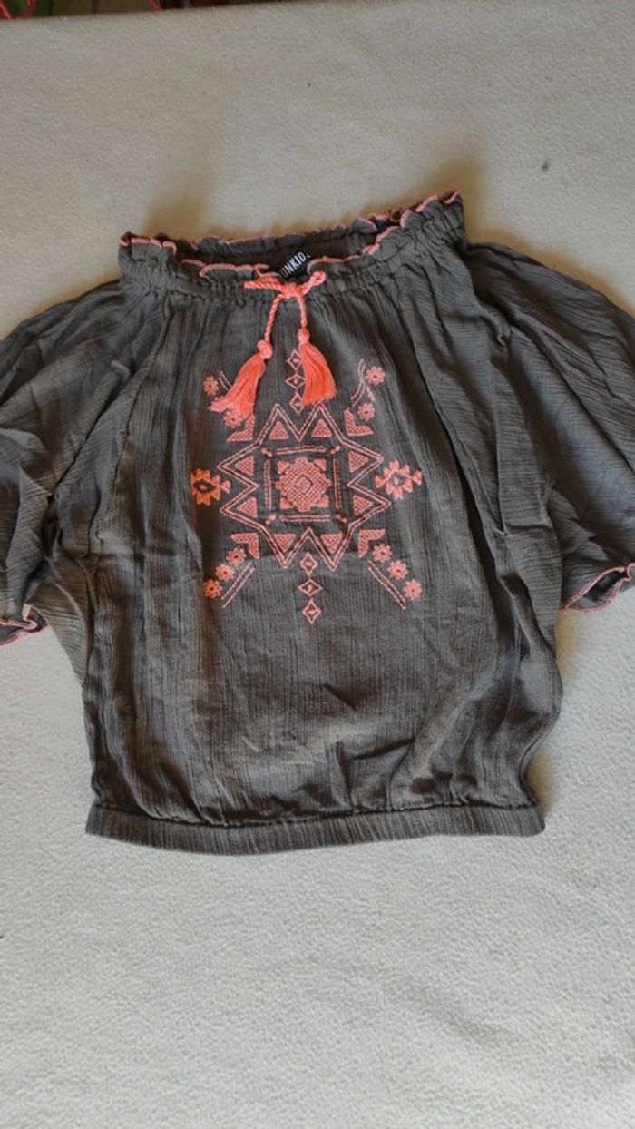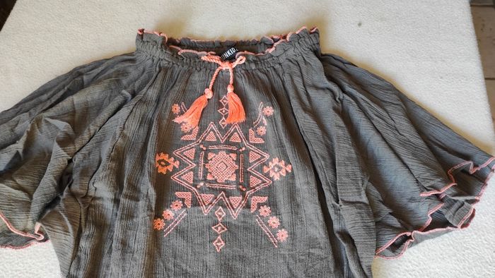 Jolie tunique manches courtes larges. Tissu effet froissé. Très bon état