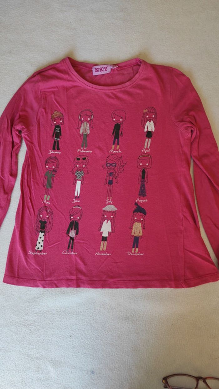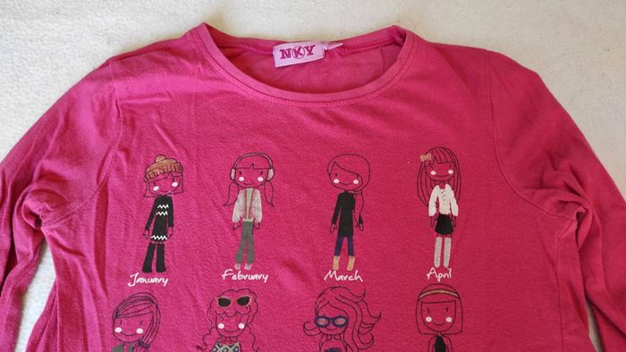 Joli tee shirt manches longues rose avec motifs personnages pour chaque mois de l'année. Très bon état
