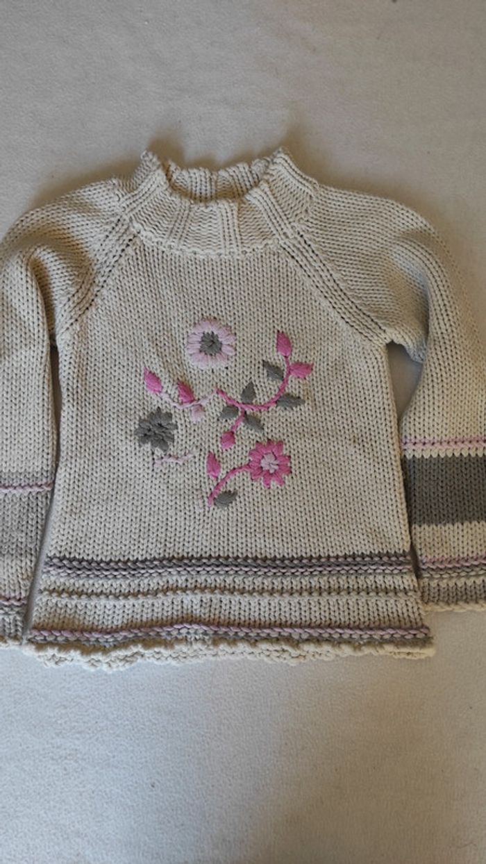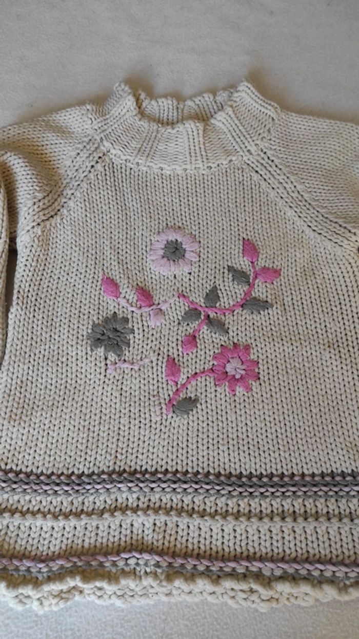 Pull col montant couleur crème avec motifs fleuris. Pull ayant servi mais reste en bon état général pour une deuxième vie.