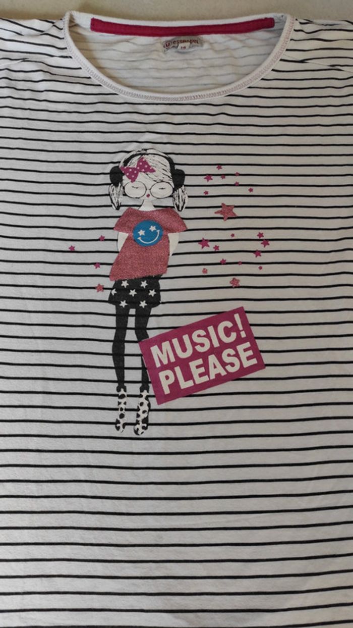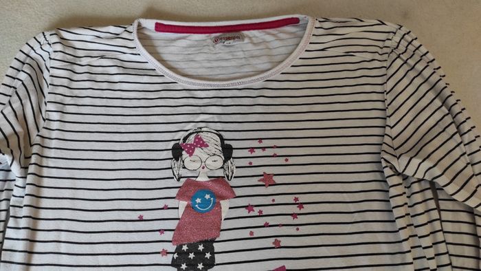 Joli tee shirt manches longues avec des rayures noires et blanches. Motif avec fille tee shirt pailleté rose. Très bon état