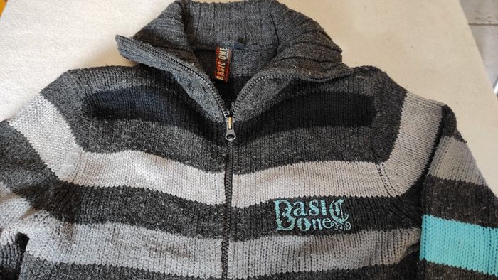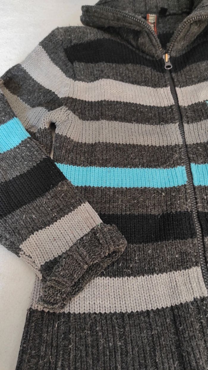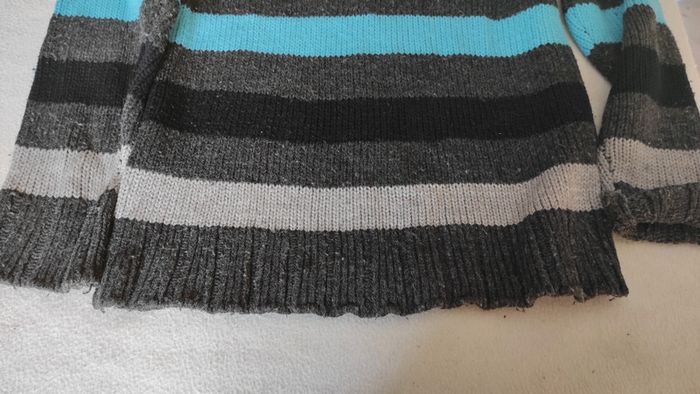 Gilet zippé à rayures. Présence de bouloches mais reste en bon état.
