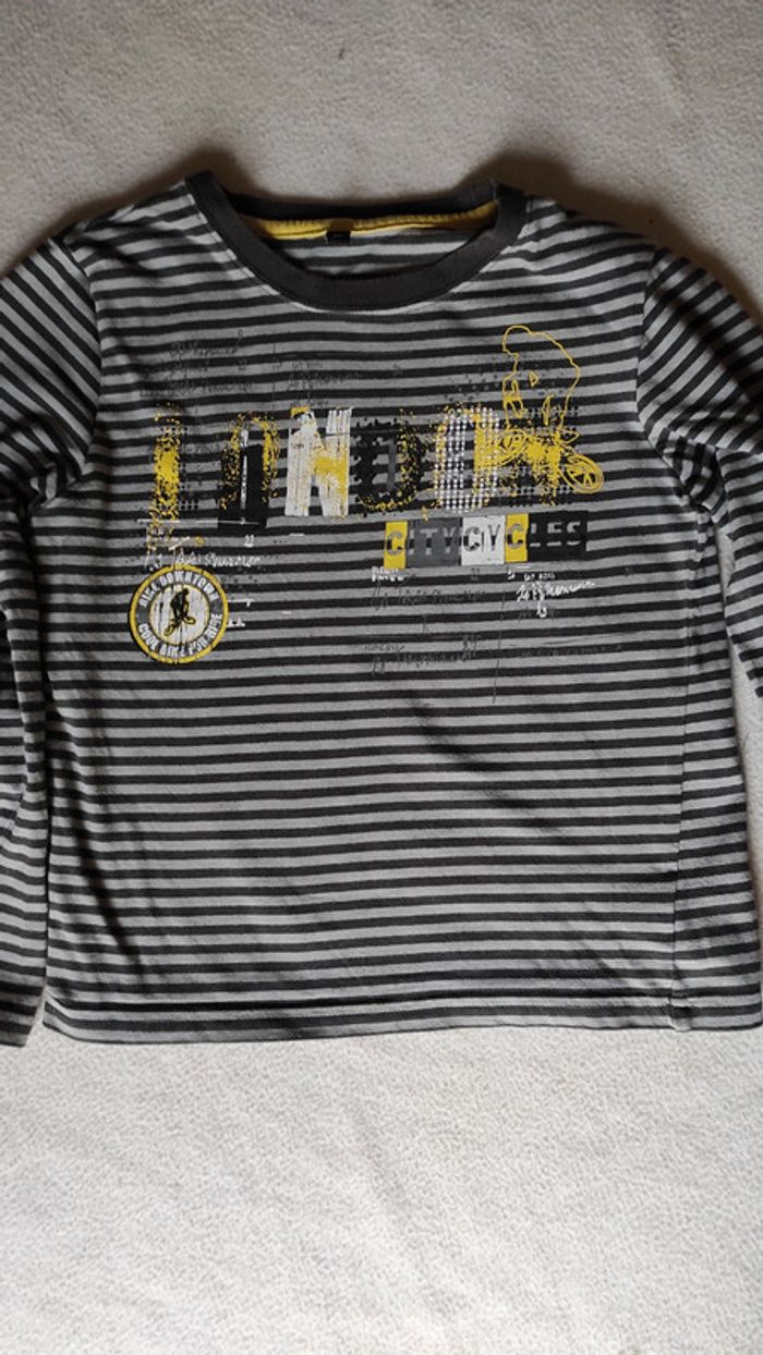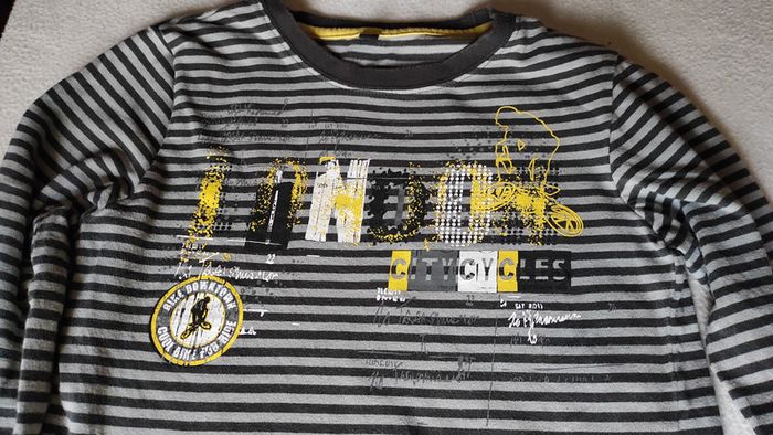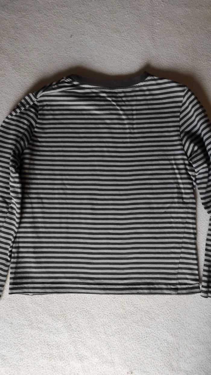 Tee-shirt manches longues à rayures grises en très bon état. 100% coton
