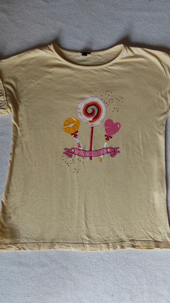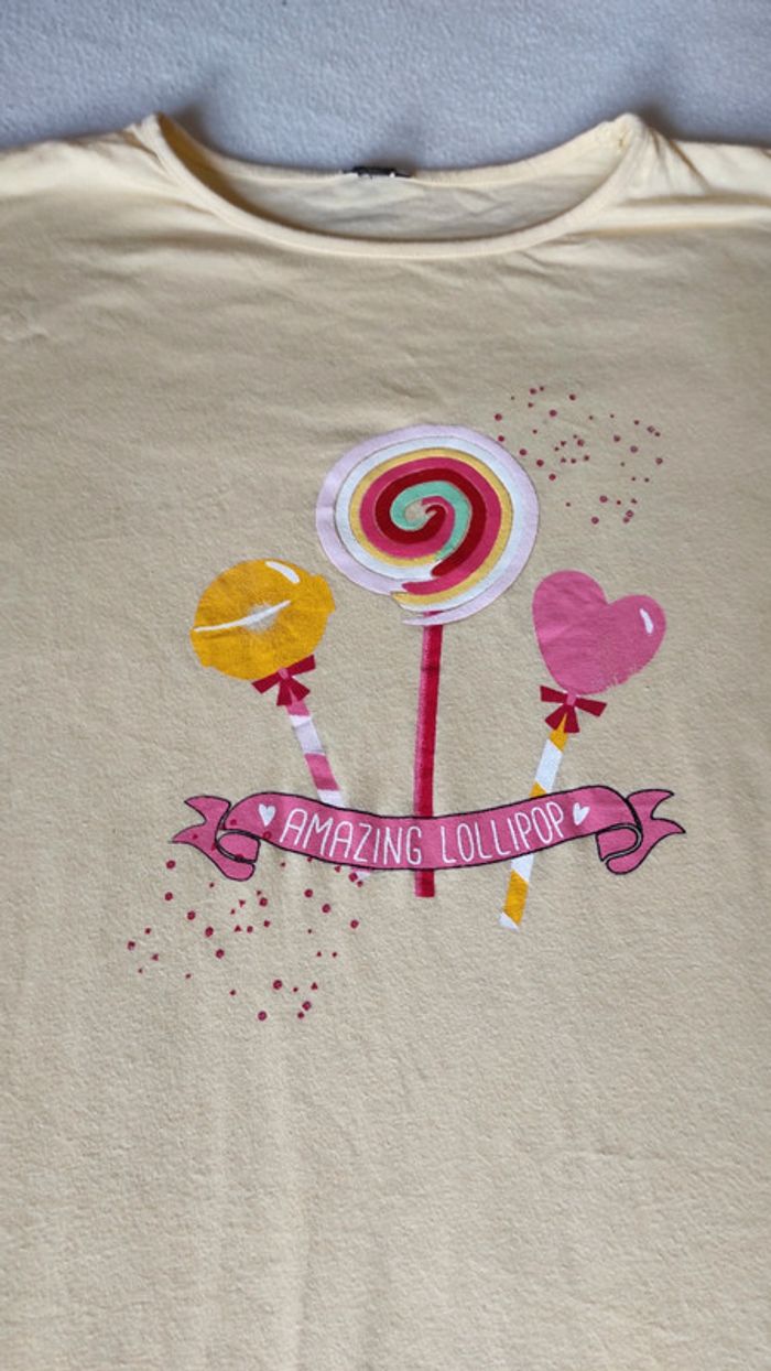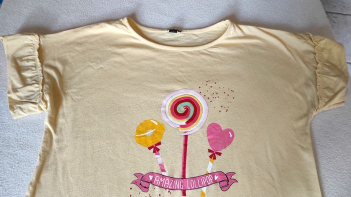 Joli tee shirt jaune manches courtes avec motifs sucettes. Très bon état