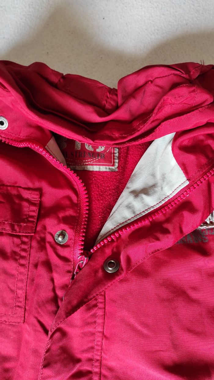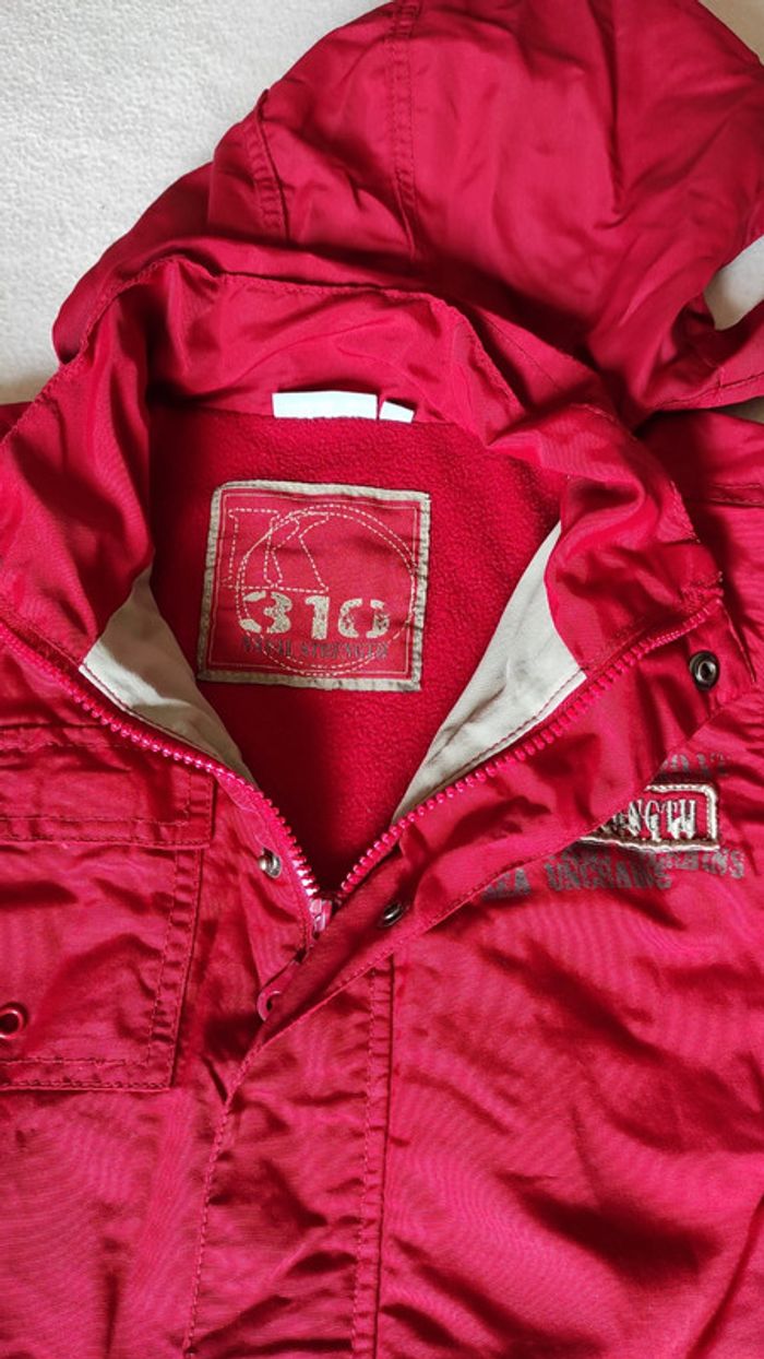 Veste blouson imperméable rouge . Fermeture éclair et boutons pression. Capuche rétractable dans l'encolure. 3 poches à l'avant. Très bon état