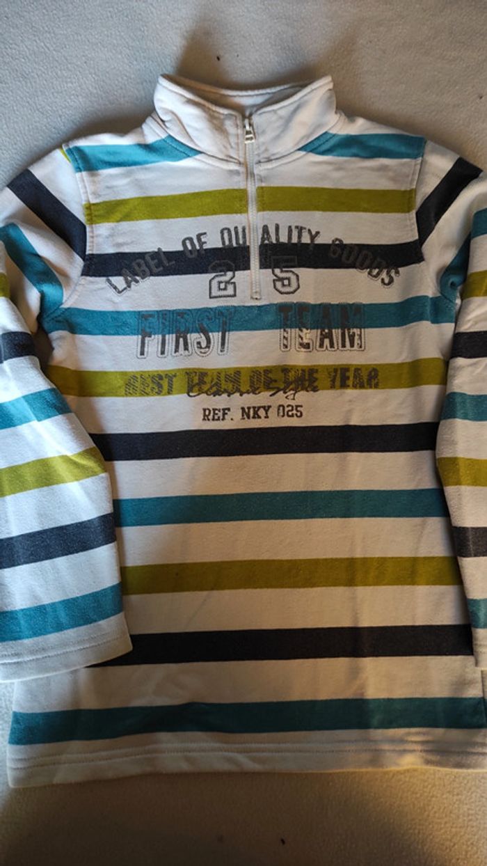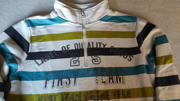 Joli sweat à rayures blanc bleu marine et vert anis. Col zippé. Très bon état.