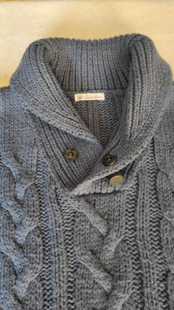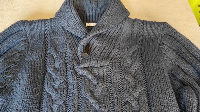 Gros pull bien chaud torsadé marine. Pull avec quelques bouloches mais peut encore avoir une deuxième vie.