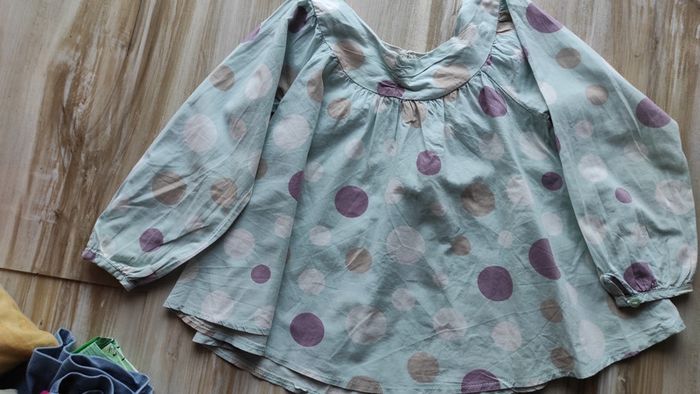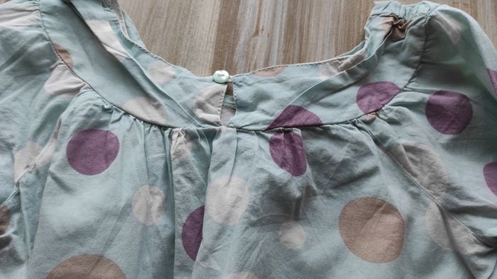Tunique bleue ciel évasée. Pois violet blanc et marron clair.