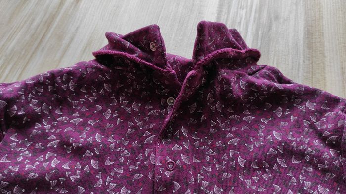 Col roulé violet avec petits motifs roses. 3 boutons pression à l'arrière pour enfiler plus facilement.
