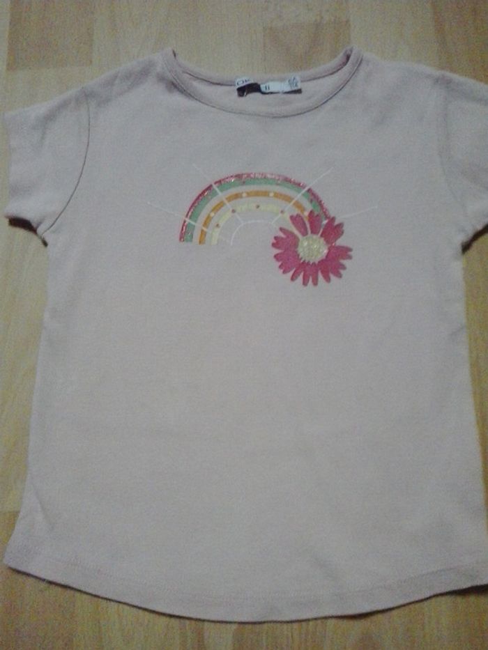 Tee-shirt rose avec motif fleur arc en ciel quelques paillettes.Manches courtes