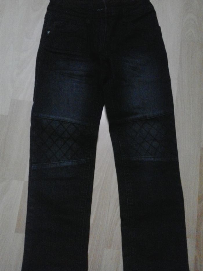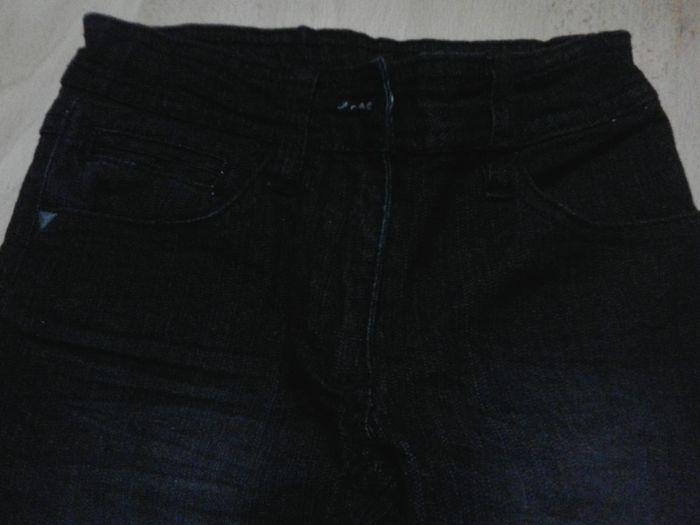 Jean bleu foncé motif croisé sur les jambes. 2 poches à l'avant et 2 poches à l'arrière. Élastique à la taille réglable.