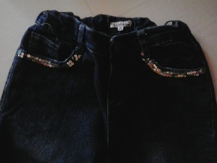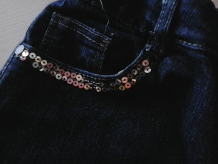 Jean bleu avec des sequins aux poches avant et arrière. Manque quelques sequins sur les différentes poches. Taille élastiquée possible