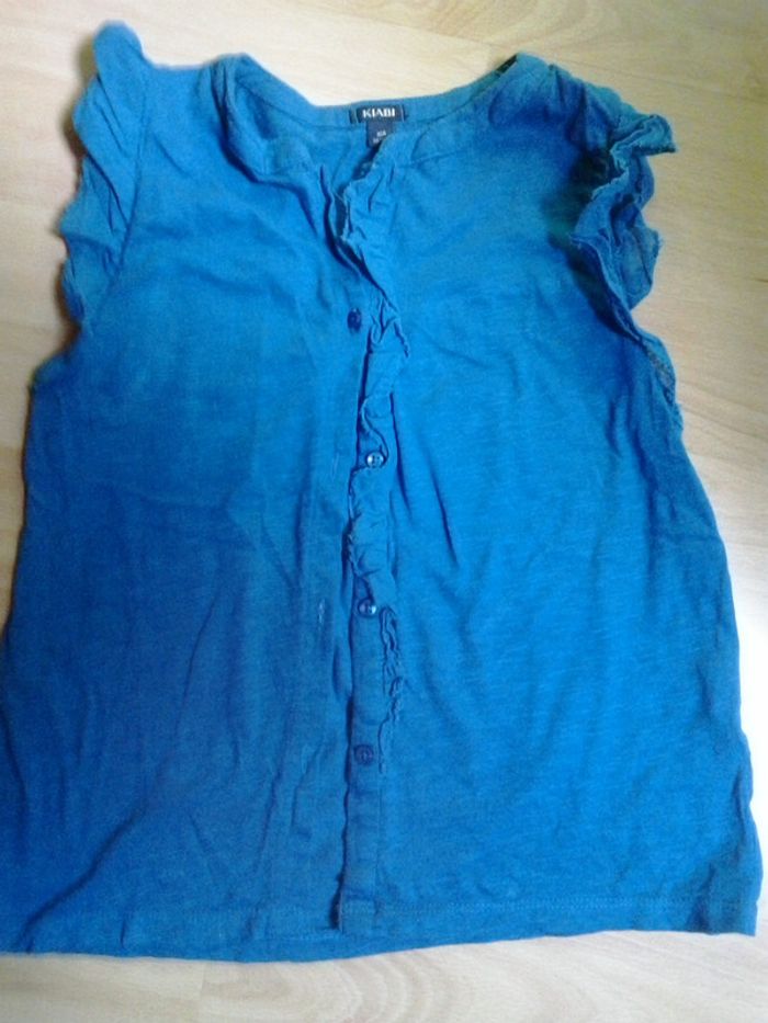 Chemisier bleu manches courtes. Petites fronces tout au long des boutons.