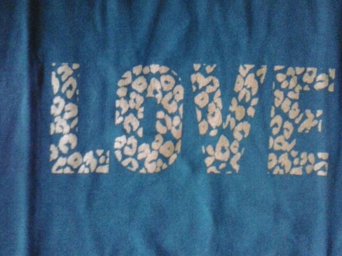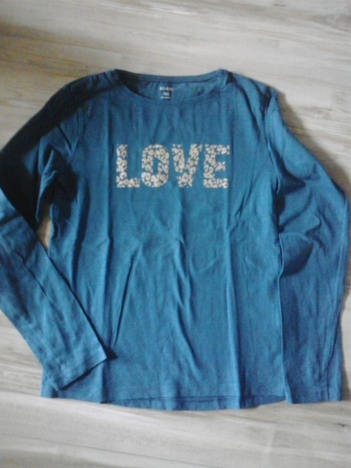 Tee-shirt bleu pétrole avec le mot LOVE écrit en doré. Manches longues. Très bon état