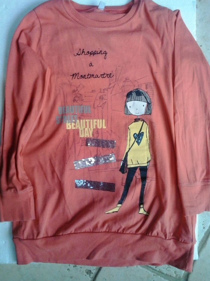 Tee-shirt long orange cintré en bas. Manches longues. 3 bandes de sequins argentés à l'avant Idéal sur un leggins. Très bon état