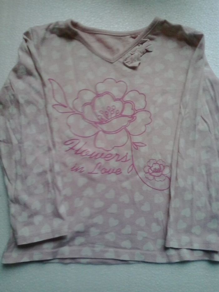 Tee- shirt fille rose et cœur blanc avec motif fleur à l'avant ainsi qu'un petit nœud en volume près du col en v
