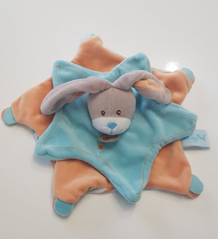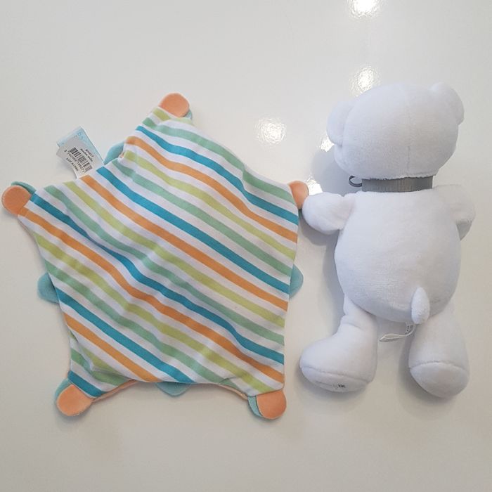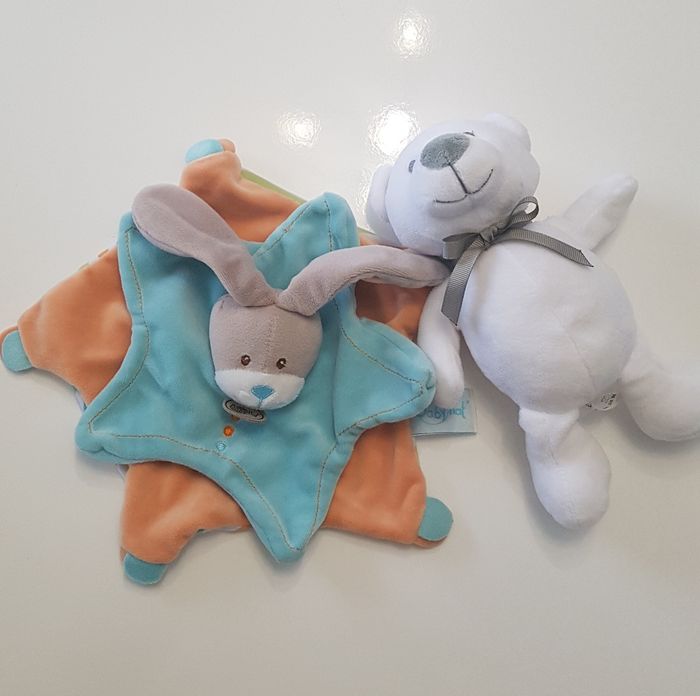 Doudou lapin en forme d'étoile de marque Baby nat et ourson Osito blanc de marque Eau my BB. Tout deux neufs sans étiquette.
