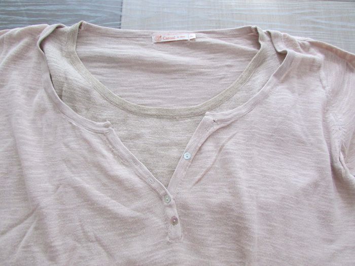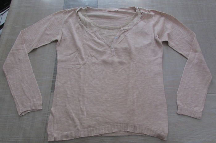 Joli pull léger de chez Gémo, effet 2 en 1 avec le dessous en fils dorés. Il a été peu porté mais j'ai perdu 1 bouton (cf.photos) Taille: XL soit 46/48 d'autres articles ici #ysatis13femmetaille46 ou #ysatis13femmetaille48 N'hésitez pas à faire un lot pour profiter des remises activées #pull #fin #gémo #femme #beige #doré #taillexl #taille46 #taille48