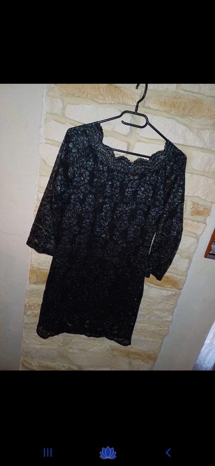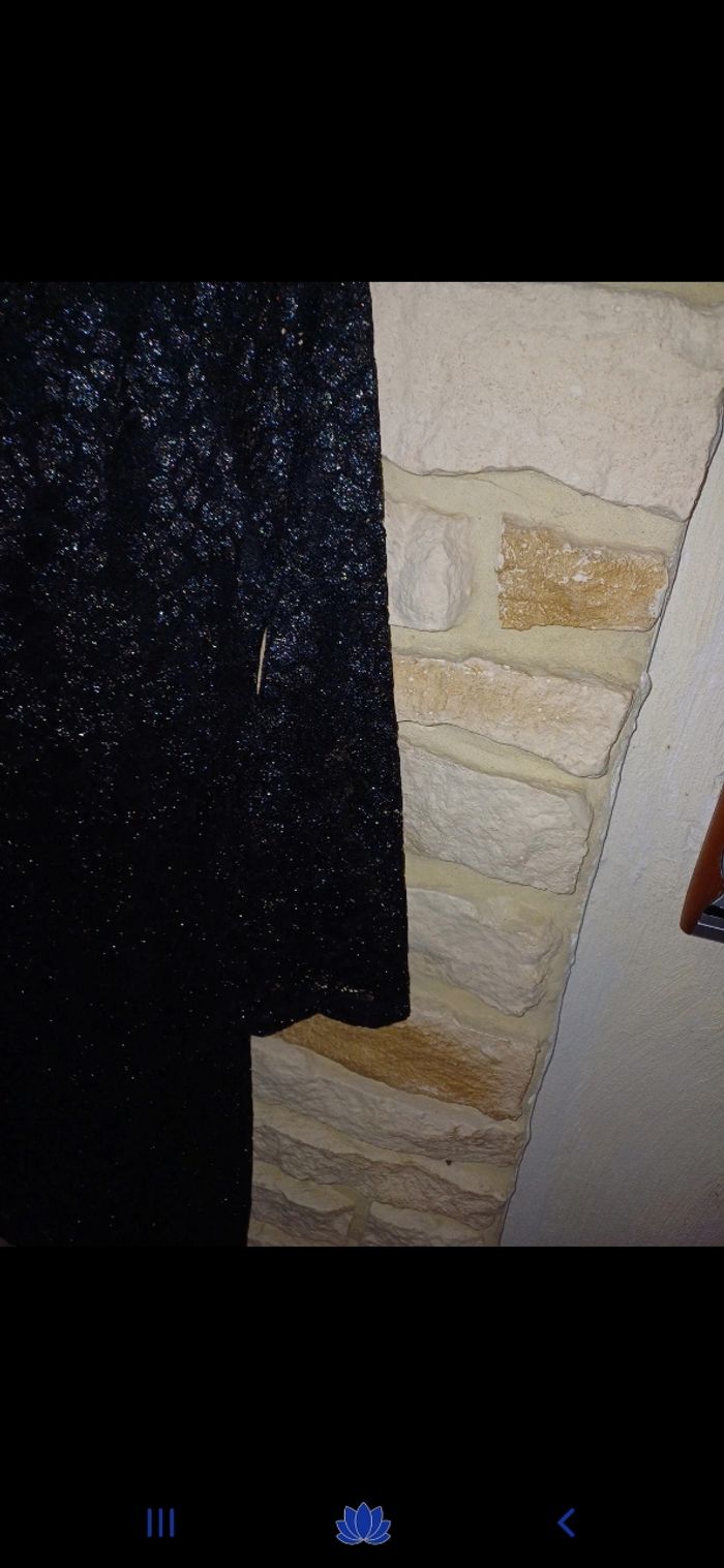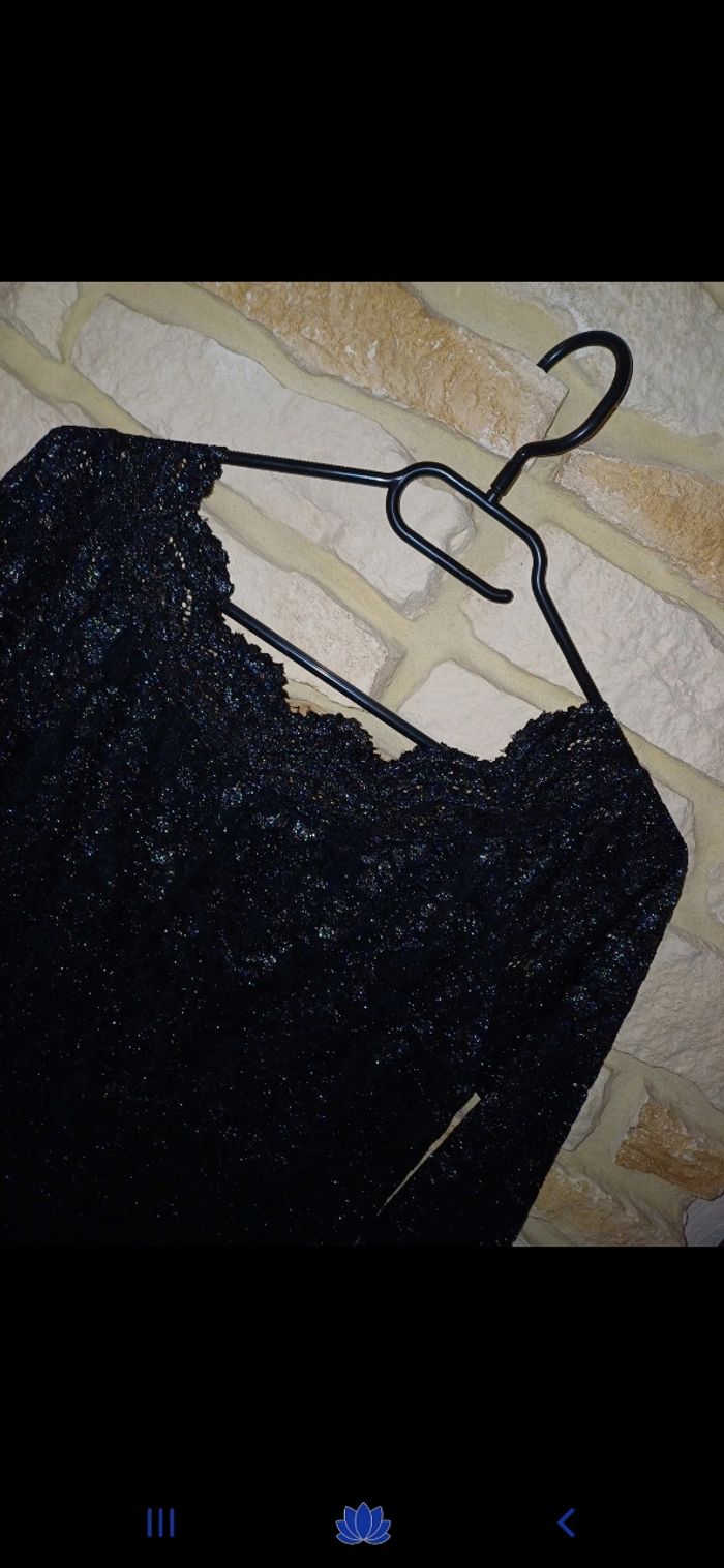 Magnifique robe noire avec dentelle au niveau de l encolure. Effet brillant. Doublée à l intérieur. Manches 3/4