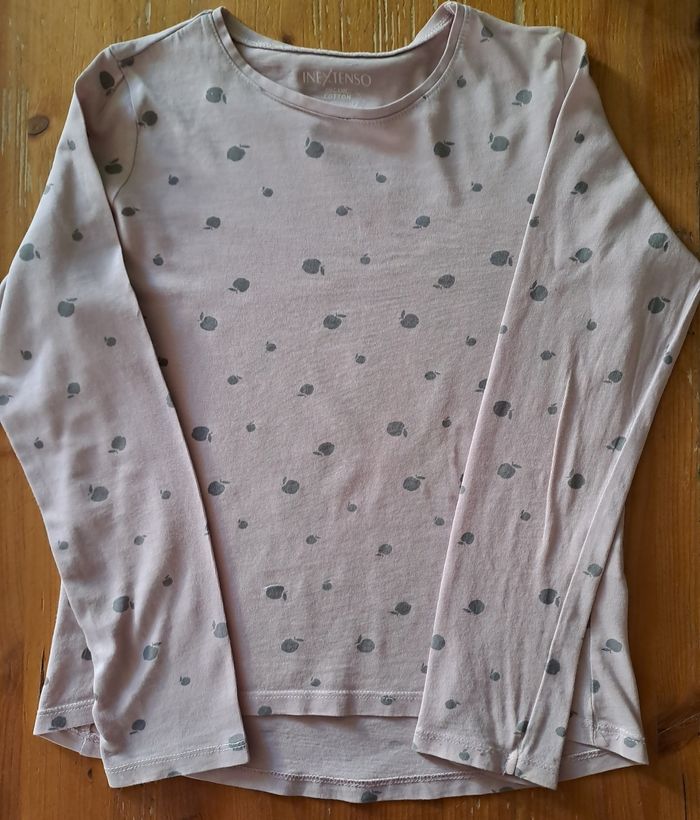 Vends un haut à manches longues de couleur rose pâle avec petits motifs de pomme argentés en 10 ans propre, lavé, repassé 1,5 E