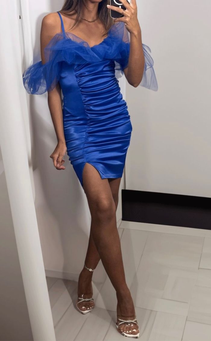 Robe satinée bleu royal avec tulle aux épaules Neuve et étiquetée Taille S/M
