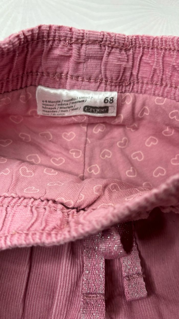 💞 Pantalon en velours doublé 💞 💕 Taille: 4/6 mois - 68 cm 💕 Marque: Ergee 💕 Couleurs: Rose avec des motifs cœurs à l’intérieur, très jolie porté avec un revers 💕 Taille élastique