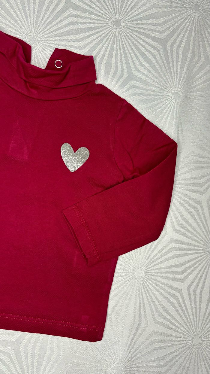 💛 Tee-shirt à manches longues et col roulé 💛 ❤️ Taille: 6 mois - 68 cm ❤️ Marque: In extenso ❤️ Couleurs: Rouge avec un cœur argenté