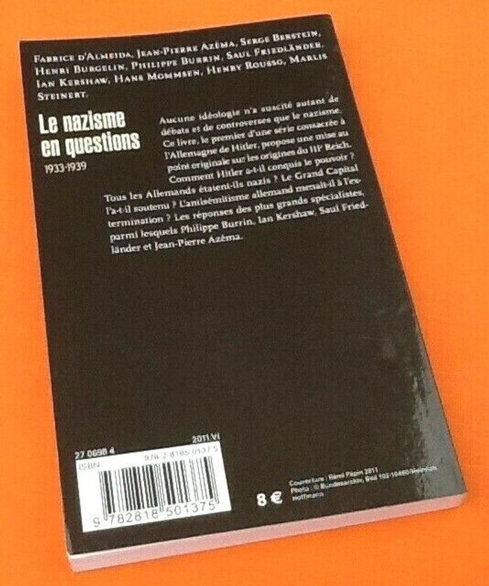FABRICE D’ALMEIDA, JEAN-PIERRE AZÉMA, SERGE BERSTEIN, HENRI BURGELIN, PHILIPPE BURRIN, SAUL FRIEDLÄNDER, IAN KERSHAW, HANS MOMMSEN, HENRY ROUSSO, MARLIS STEINER Le Nazisme en questions (1933-1939) L' Histoire 218 pages (2011) Pluriel L' Histoire (180x110)mm Poids : 185grs Aucune idéologie n’a suscité autant de débats et de controverses que le nazisme. Ce livre, le premier d’une série consacrée à l’Allemagne de Hitler, propose une mise au point originale sur les origines du IIIe Reich. Comment Hitler a-t-il conquis le pouvoir ? Tous les Allemands étaient-ils nazis ? Le Grand Capital l’a-t-il soutenu ? L’antisémitisme allemand menait-il à l’extermination ? Les réponses des plus grands spécialistes, parmi lesquels Philippe Burrin, Ian Kershaw, Saul Friedländer et Jean-Pierre Azéma.