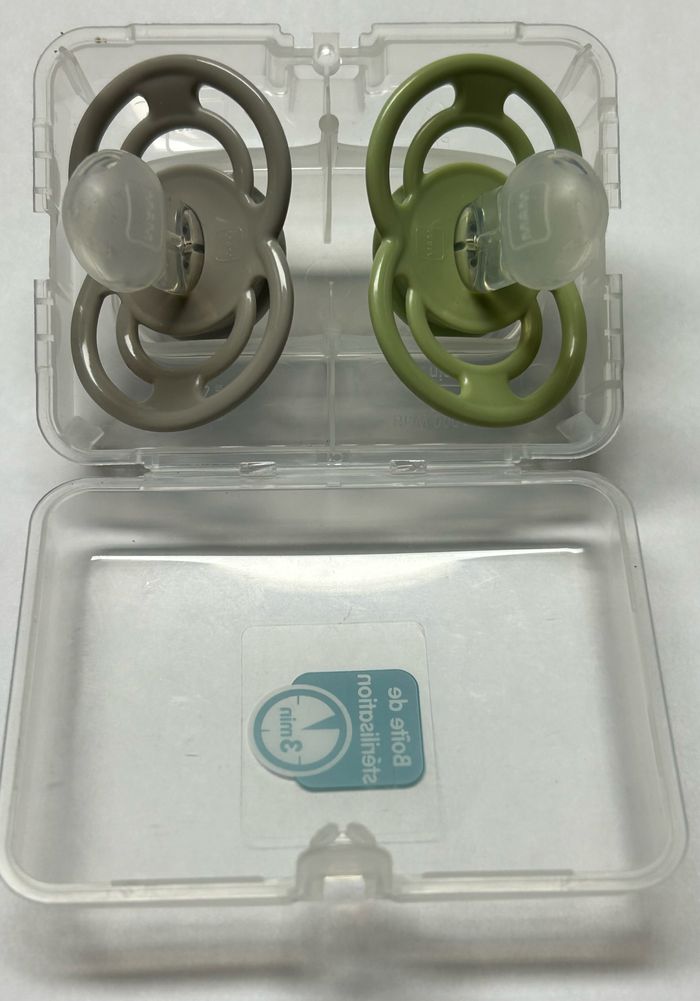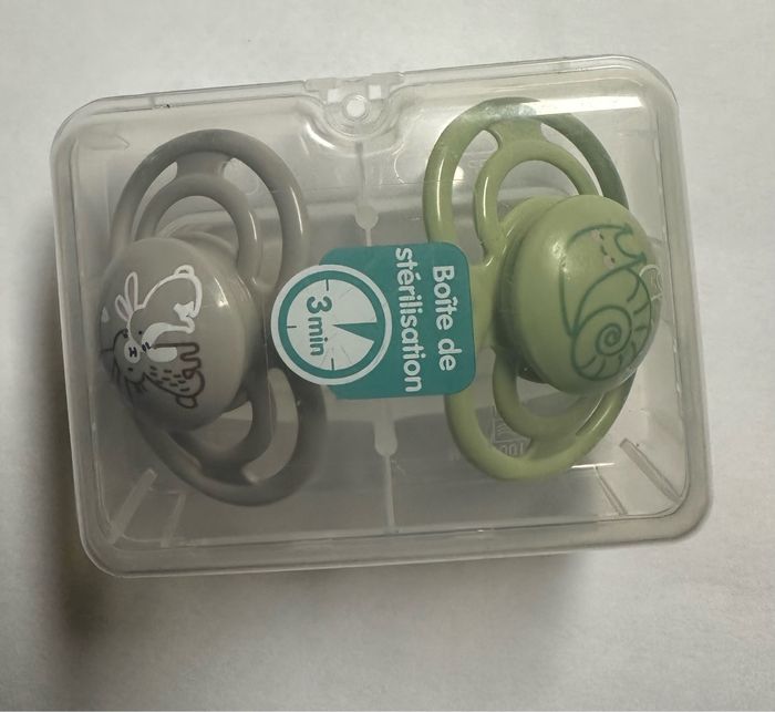 Lot de 2 sucettes neuves dans leur boîte de stérilisation 6 M+