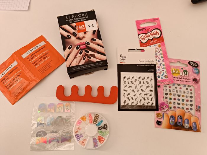 Lot nail art Comprends : Lingettes dissolvantes Sephora 4 paquets de stickers décoratifs de marques différentes Strass Sephora avec colle (paquet noir) Séparateur doigts en mousse Décorations ongles diverses
