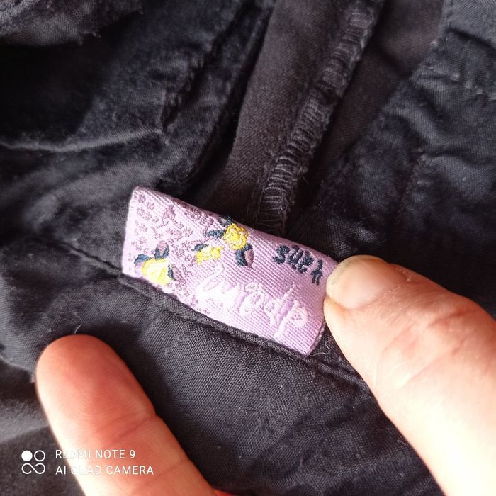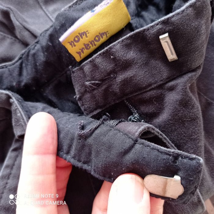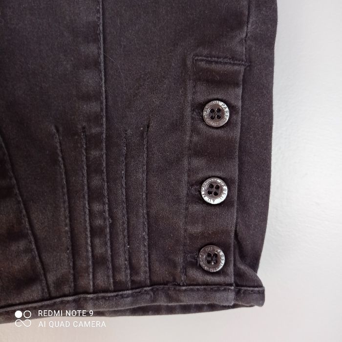 Un bouton manquant mais fermeture par agrafe. Le noir n' est pas vif. Coton élasthanne.