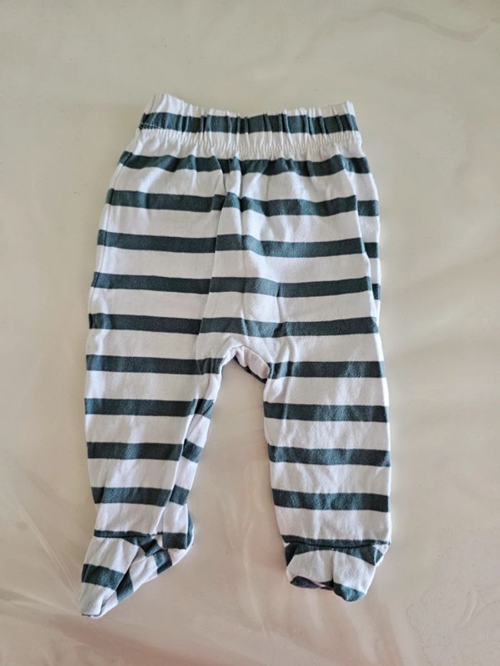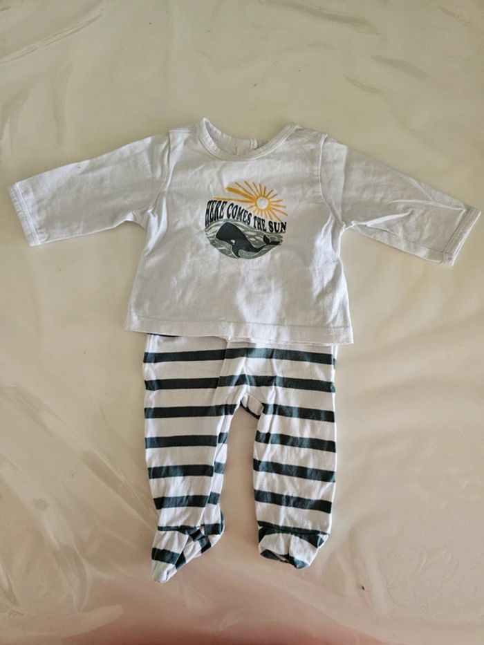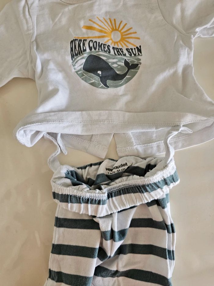 Ensemble baleine : - tee-shirt blanc manche longue ouverture pressions dans le dos. - pantalon avec les pieds couverts rayé blanc et vert foncé Attache pression entre le haut et le bas. Très bon état. 1 mois/54 cm Vertbaudet