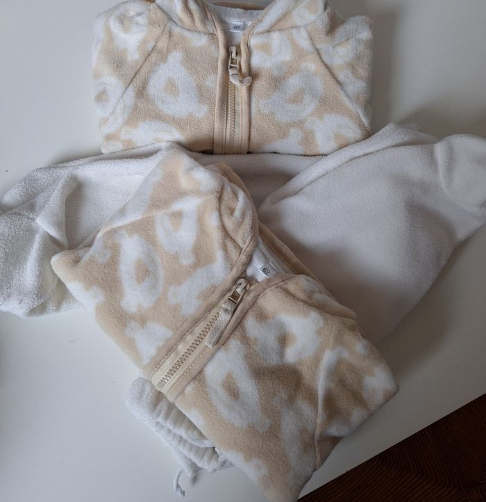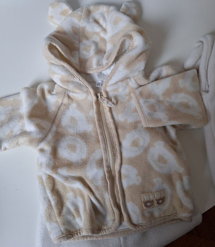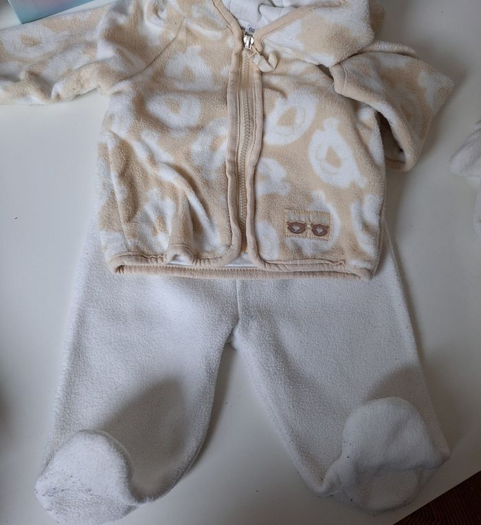 GARÇON 3 MOIS JUMEAUX N°57 2 ensemble Polaire Beige / blanc - veste capuche oreille Imprimé tête d ours Polaire / zippé 100% polyester Doublure 100% coton -pantalon blanc Polaire , Elastique taille Pied 100% polyester Taille 3 mois 5€ #kelly_garçon3moisjumeaux