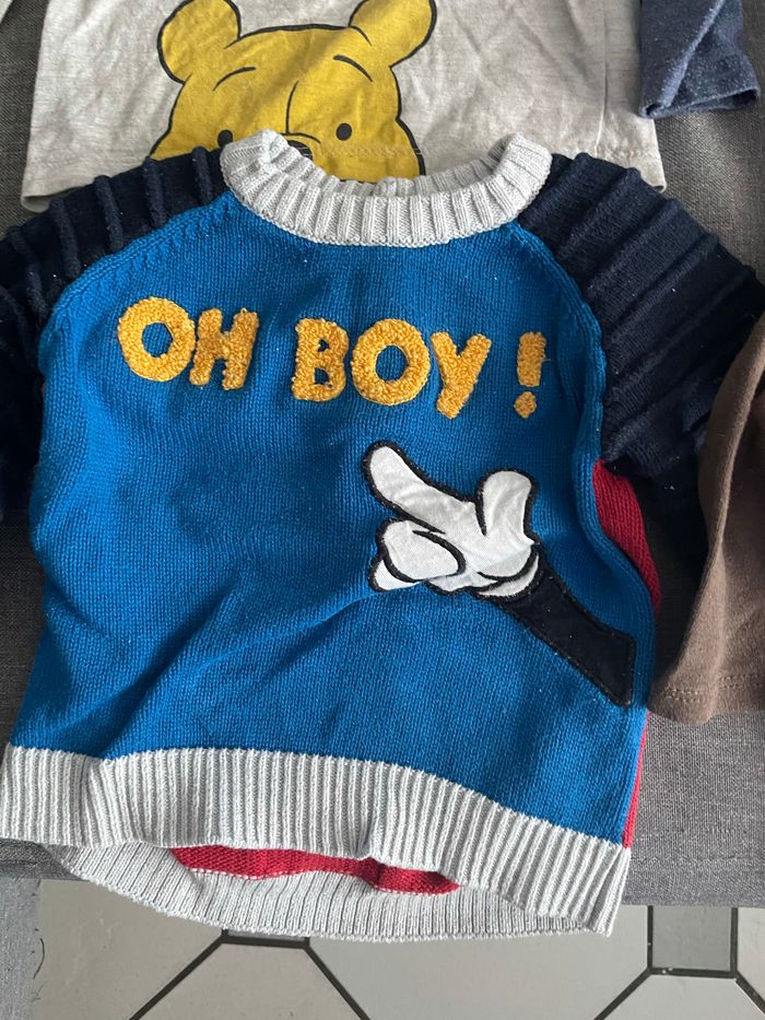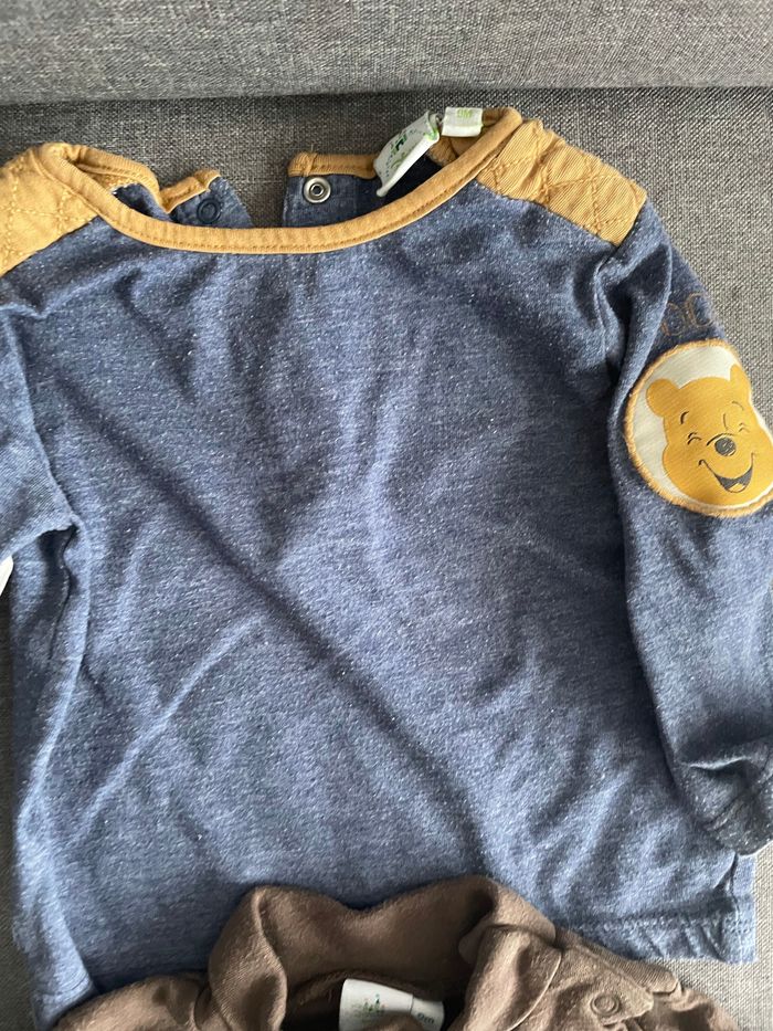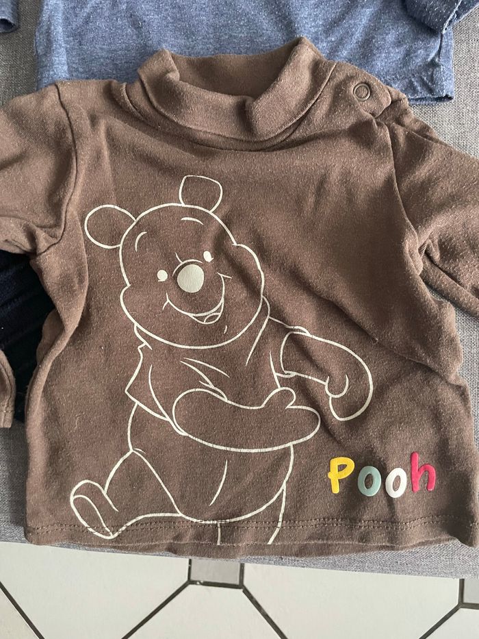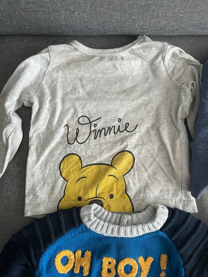 Bonjour, Je vends un lot de 3 tshirts manches longues et un pull de la taille 9mois Disney Winnie l’ourson